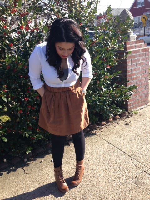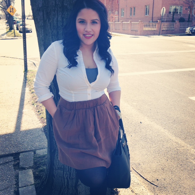 White Collared Shirt: Forever 21/Skirt: Forever 21/Black Opaque Tights: Target